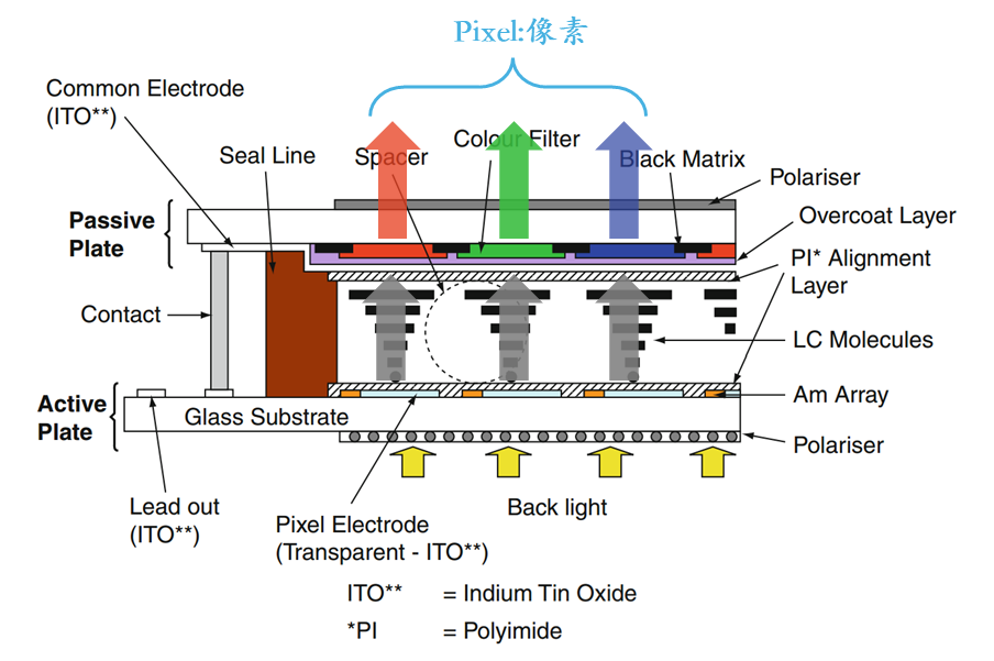 LCD (paparan kristal cecair), sebagai penyelesaian paparan yang paling matang dan meluas, beroperasi pada prinsip asas berikut: Unit latar belakang memancarkan cahaya putih, yang melalui polarizer dan lapisan kristal cecair sebelum mencapai penapis warna RGB untuk menghasilkan tiga warna utama. Akhirnya, kecerahan setiap piksel diselaraskan dengan mengawal orientasi molekul kristal cecair melalui voltan yang digunakan. Proses ini bergantung pada kerja yang diselaraskan beberapa komponen teras: unit lampu latar, array TFT, lapisan kristal cecair, dan penapis warna.