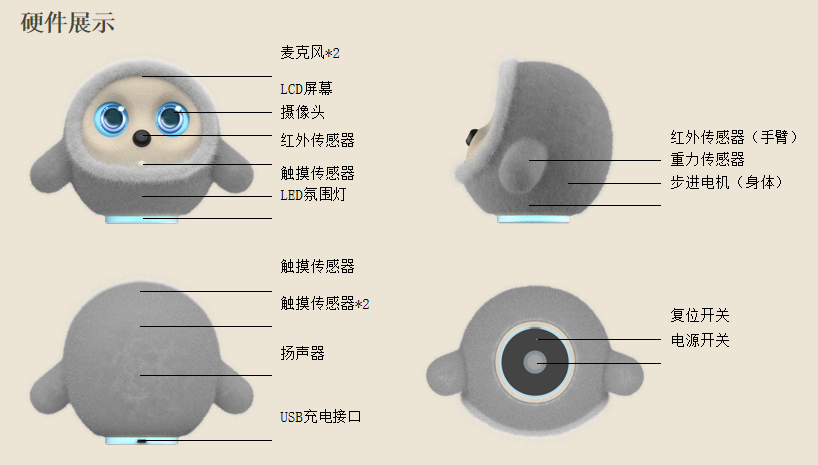 Sistem Audio-Visual: Pembesar suara penuh 5W output kesan bunyi berkualiti tinggi yang sepadan dengan emosi; Jalur lampu LED berwarna penuh menyegerakkan perubahan untuk mengukuhkan ekspresi keadaan emosi.