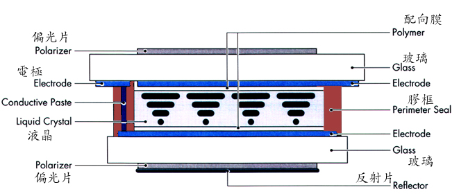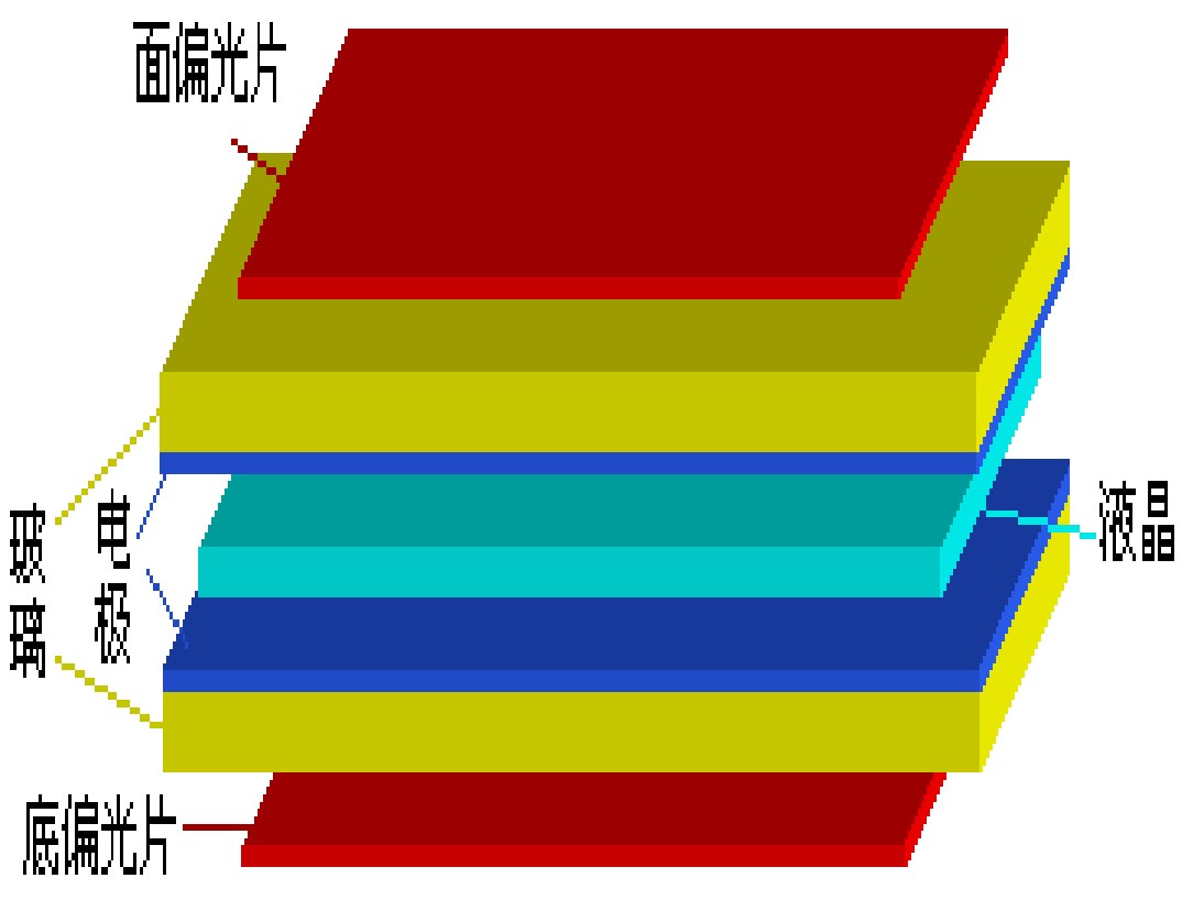 Struktur teras LCD terdiri daripada pelbagai bahan berlapis yang tepat, termasuk polarizer, elektrod, tampalan konduktif, kristal cecair, filem penjajaran, substrat kaca, meterai perimeter, dan reflektor. Setiap lapisan bahan berfungsi dengan fungsi yang unik: