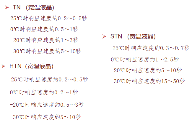 Kelajuan tindak balas, termasuk masa kenaikan (TR) dan masa jatuh (TF), mengukur seberapa cepat skrin LCD bertindak balas terhadap isyarat. Ciri -ciri rheologi kristal cecair menentukan pergantungan suhu yang kuat: semakin rendah suhu, semakin tinggi kelikatan kristal cecair, dan lebih perlahan kelajuan tindak balas.